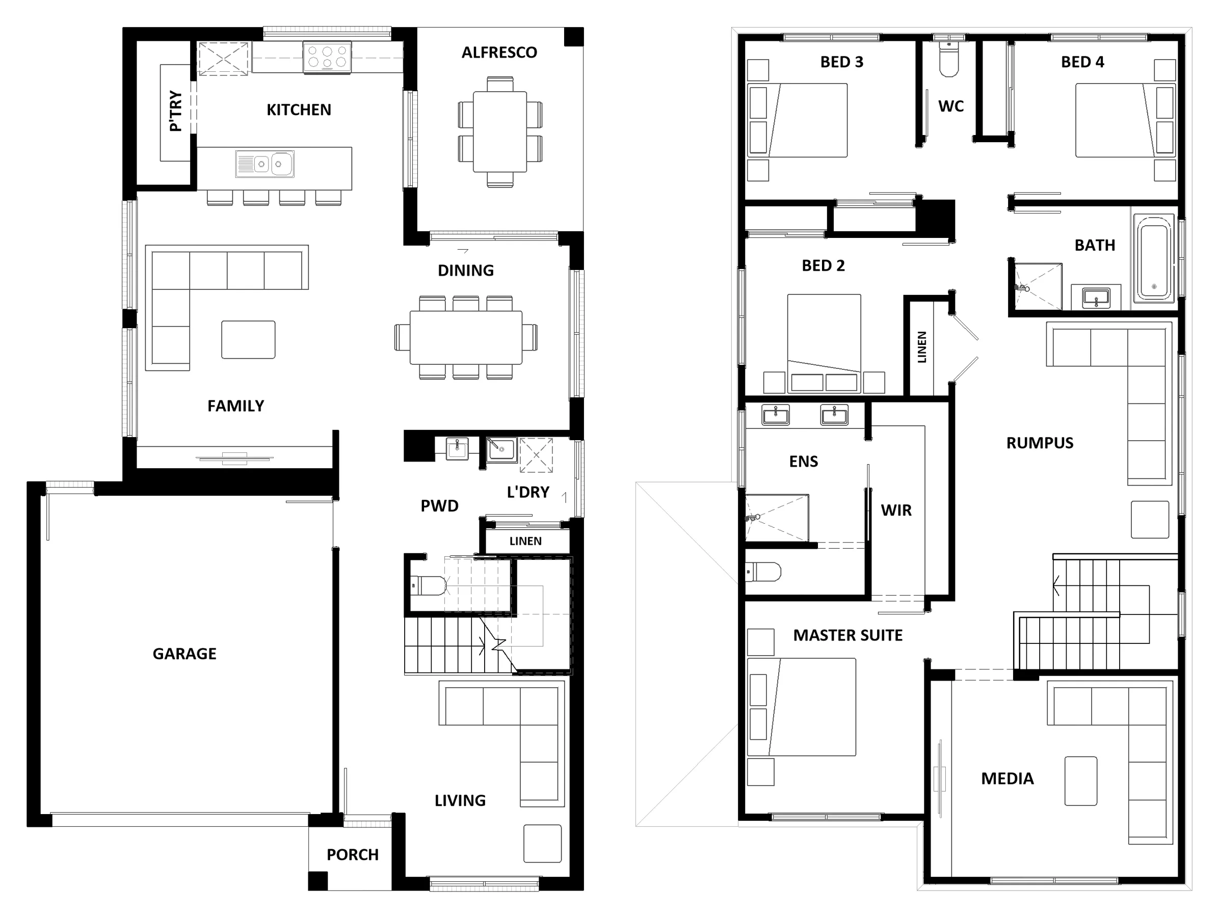 Spacious yet welcoming, the Alameda 275 offers all the modern luxuries. Step inside and you’ll find the formal living room, cleverly zoned away from the rest of the home to create an air of tranquillity. At the rear of the home, the entertainer’s kitchen overlooks the family and dining area and flows onto the beautiful outdoor alfresco. The ground floor also features a guest powder room and laundry area with clever storage. Upstairs you’ll find four spacious bedrooms, a versatile rumpus area and stunning media room, offering plenty of space for growing children. The master suite is your own private sanctuary, complete with an oversized walk-through robe and ensuite with double vanity. The Alameda 275 is an entertainer’s paradise your family and friends will love for years to come.