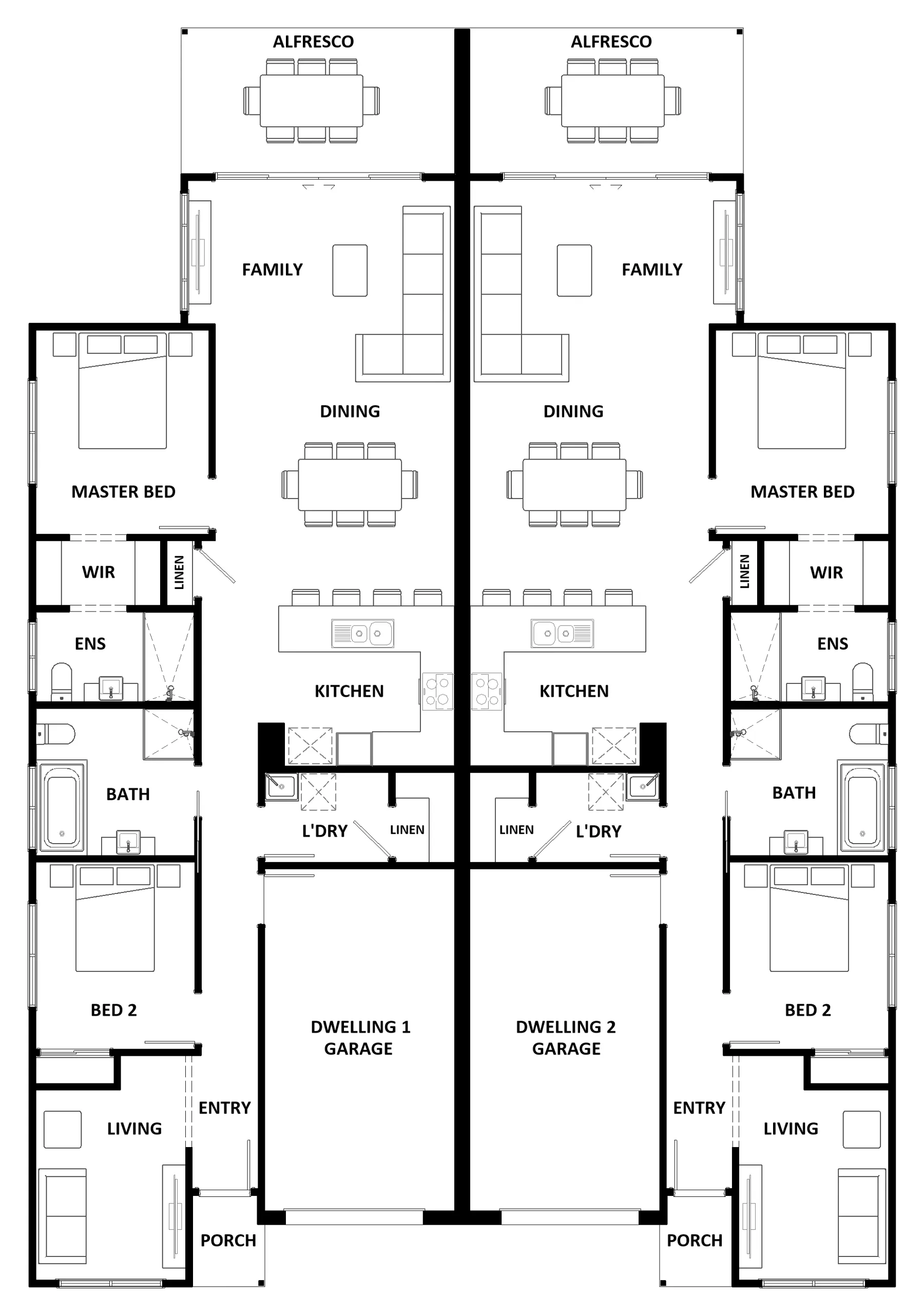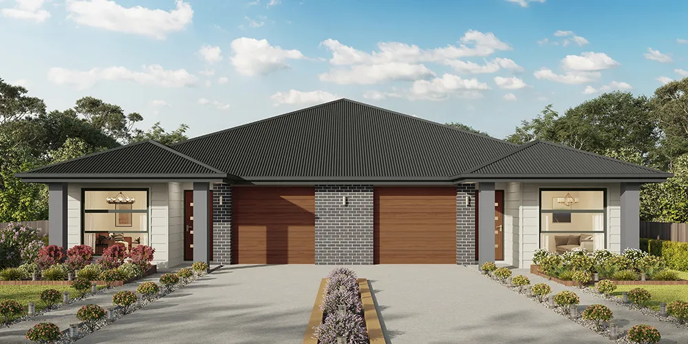 The Ruby 298 is an innovative duplex design, which cleverly incorporates luxury features into a compact mirrored floor plan. Each residence features a single garage, two bedrooms and two living areas. Step inside and you are welcomed into the first living room, providing a quiet space secluded from the central living hub. Down the hall, you’ll find the first of two bedrooms, central family bathroom and laundry. At the rear of the home, the master bedroom features a unique walk-through robe and private ensuite. The kitchen, dining and family area are combined to create one continuous space that flows naturally onto the alfresco, where you can enjoy the sun and watch the kids play. The Ruby 298 is thoughtfully designed to maximise living space and get the most out of your block.