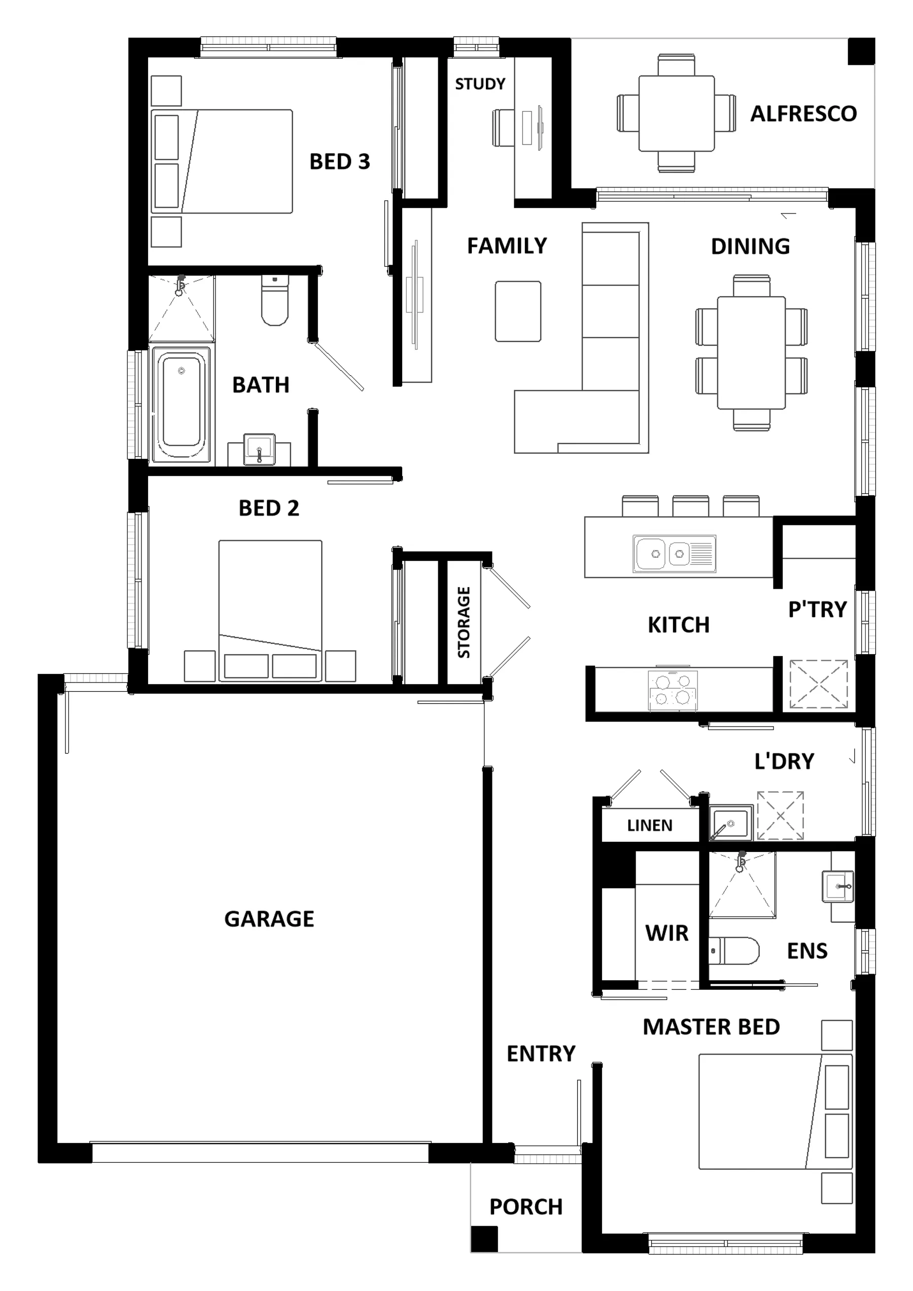 A compact design that incorporates all the features you would want in a first home. The Apsley 162 is the ideal home for a young family. Key features include a master bedroom with an ensuite and walk-in robe, two bedrooms with a bathroom, open-plan living with direct access to the alfresco, study nook and double car garage.